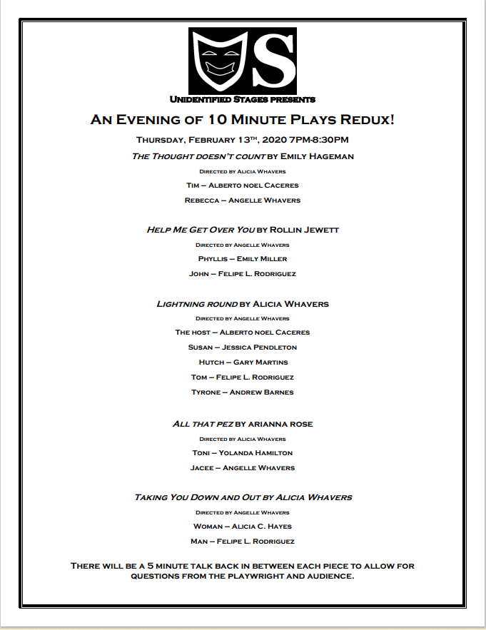 An Evening of 10 Minute Plays Redux! Posted on January 24, 2021January 24, 2021 by Alicia Whavers in Uncategorized Thursday, January 23rd, 2020 at 7PM